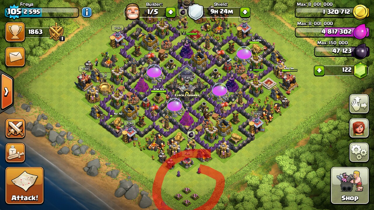 Postupně umísťujeme jednu jednotku za druhou dokud obrana není tam, kde ji potřebujeme. Pokud vlastníme poison spell, hodíme na jednotky spell a pak už pokračujeme tak, že utvoříme z jednotek (luk, barbar, wizard,...) pomyslný kruh okolo obrany a zničíme ji.